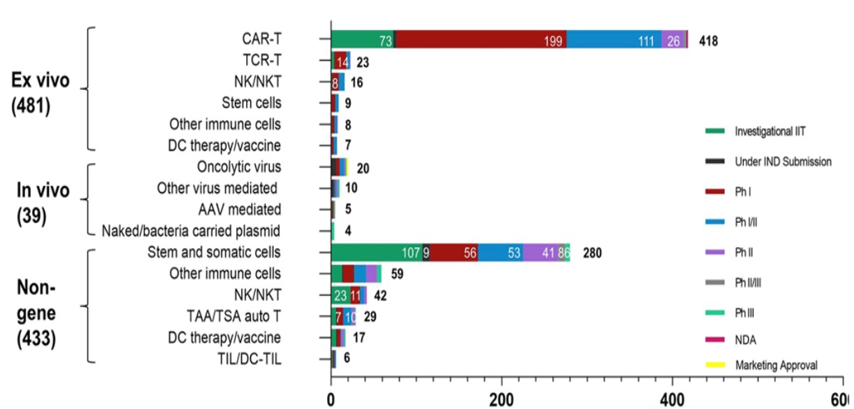 据公开数据显示,全球CGT大多数处于早期研发阶段(包括临床前研究和临床期),CGT市场处于萌芽期。我国开展的CGT临床试验数量目前位居全球第二,临床开发热情高涨。为进一步拓展这个领域,国家从十三五到十四五期间出台了很多政策与CGT相关的治疗原则,旨在加快产业发展。