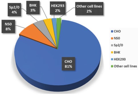 CHO细胞是最常用的宿主细胞,从1987 年到20212月,通过培养的哺乳动物细胞生产的获批生物药中有 81% 是使用CHO细胞生产。