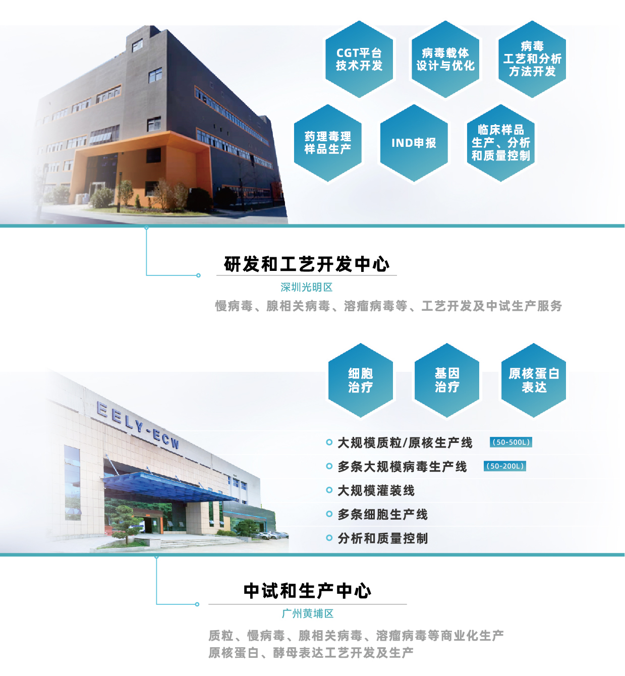 目前有深圳光明区研发和工艺开发中心和广州黄埔区中试和生产中心两大基地。基地建设基于QbD理念设计,具备符合国际标准的cGMP生产设施,独立的GMP生产线,全封闭系统,有效防止批间交叉污染;另外,产能布局灵活,满足不同INDBLA到商业化规模的生产。